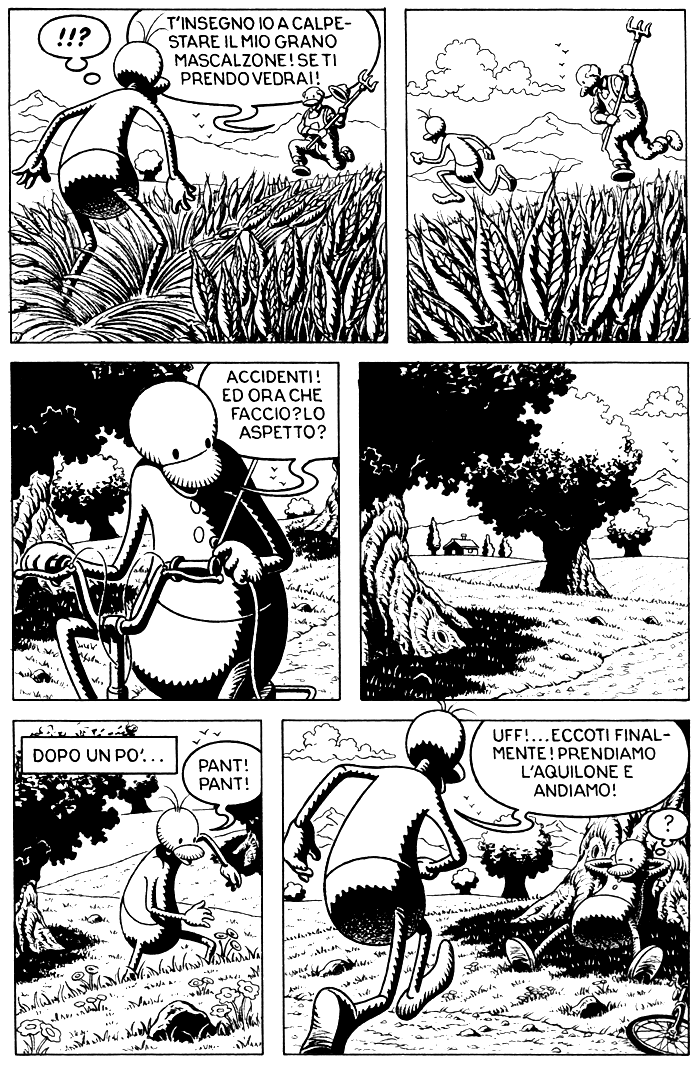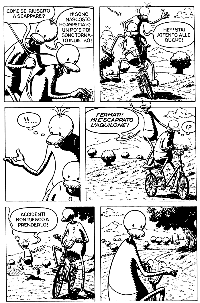 Birillo e Polpetta rappresentano l’unica mia serie a fumetti finora realizzata, a parte qualche esperimento con brevi storie e alcune prove giovanili. Nascono nel 1993 e, ancora oggi, ritengo il progetto aperto, nonostante le numerose e lunghe interruzioni. In queste storie ho riversato i miei ricordi d’infanzia, come le vacanze estive dai miei nonni materni, miscelati a molti spunti fantastici. Non ho mai avuto intenzione di rifarmi a un genere particolare di fumetto, ho elaborato piuttosto uno stile più semplice, servendomi esclusivamente di pennarelli UNI PIN fine line, a eccezione della china per le “zone nere”. A questo progetto sono particolarmente legato.